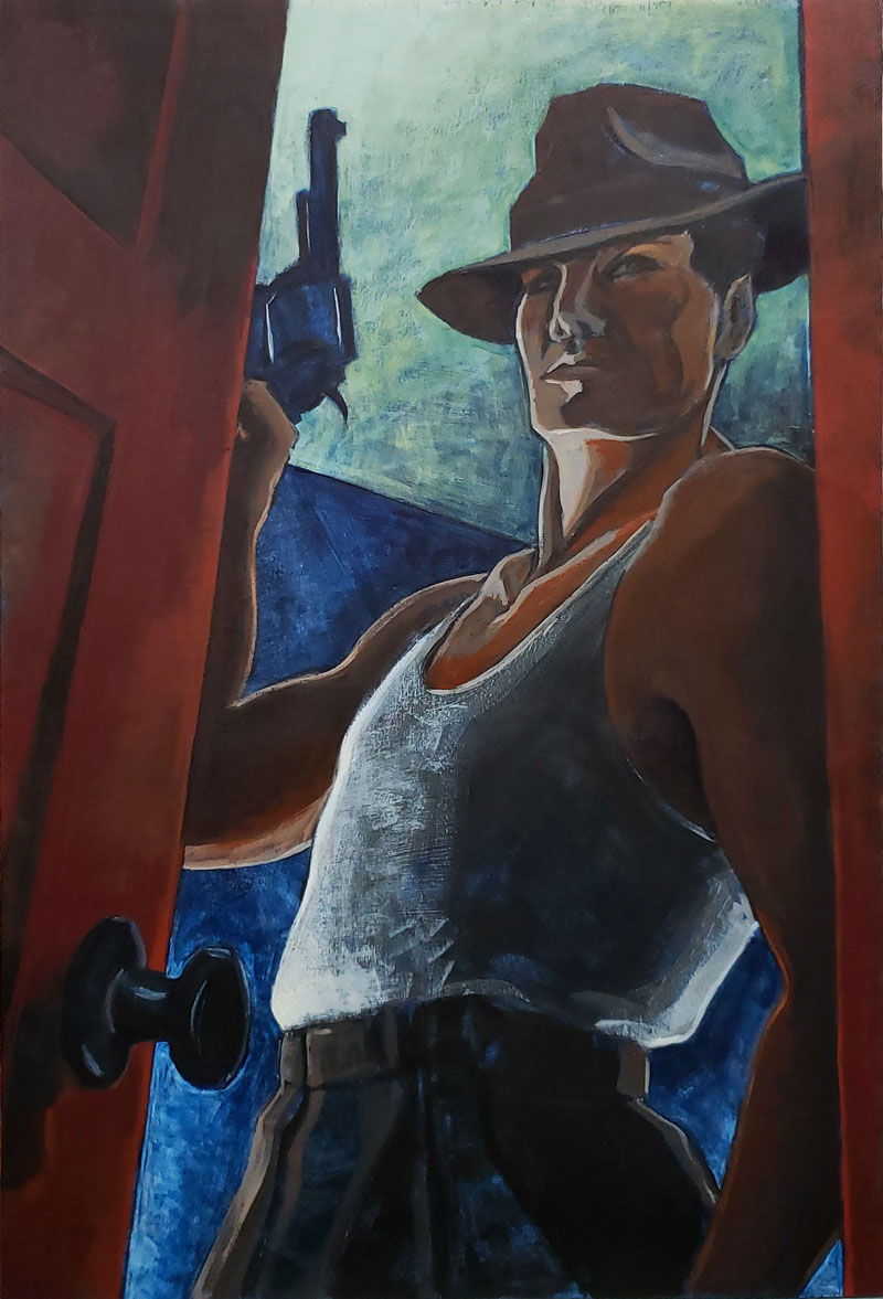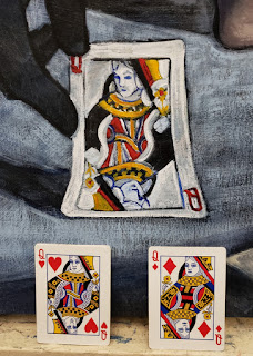 With this new beauty, I felt inspired to make a painting with a woman playing cards with us, the viewer, and at the same time doling out our fate. A real woman, and a quasi-super-natural element of fate at the same time. The question was, which suit should I make her? Which suit would pack the most amount of symbolic punch? I solved it by creating an engaging online poll in my social media communities, asking my fans to vote on which suit, hearts or diamonds would best represent my newest femme fatale. The Queen of Hearts got a good showing, The Queen of Diamonds was the undisputed winner.