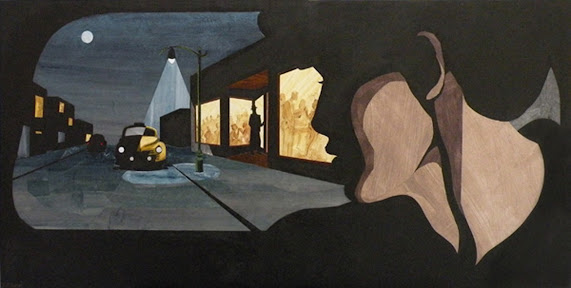 This is a piece that went through many changes. Originally I had multiple people in the street scene as if there where a bunch of people milling around. But as things developed I could see the figures were just a distraction from the real drama. I even considered taking out the figure near the door and just leaving the car- I still don’t know if I made the right choice. Don’t be surprised if you see another version of this one. (I often feel compelled to do certain images again and again.) This one was just really fun. I loved working with the street light creating a cone of a lighter color. The back window of her vehicle creates a frame within a frame, and the dark color flows into her silhouetted profile and the buildings on the street. I tried to make a contrast with the bright yellow, the cool watercolor blues, and the flat dark brown/black. Keep your eye open for a woodcut version of this piece!
