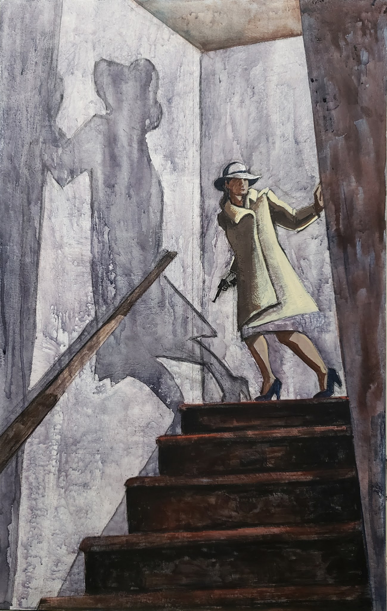 I spent a bunch of time creating a wood grain effect on the stairs, thinking the reddish tone would enhance my purple shadows.