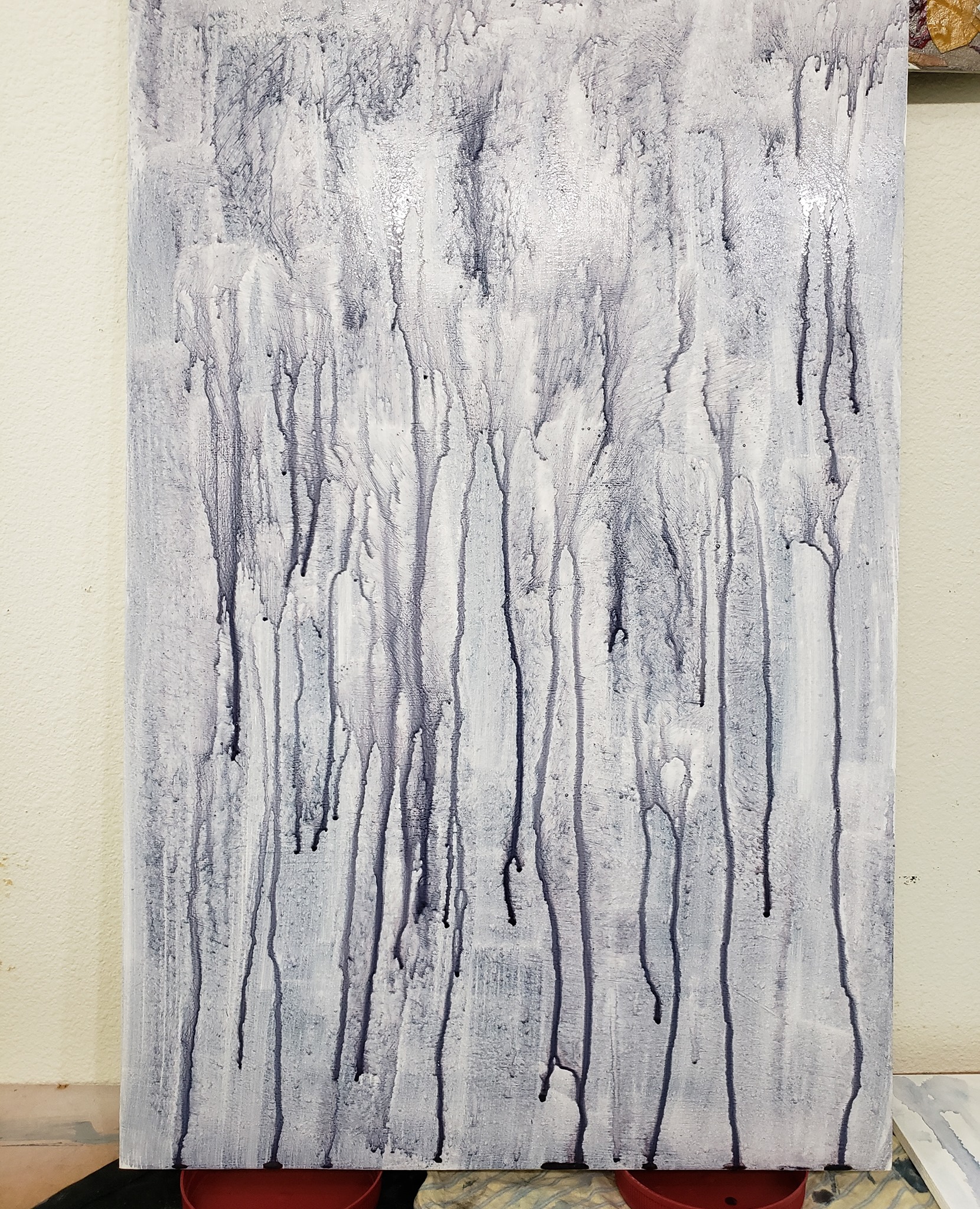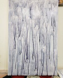 So, in April 2021, I took a video of myself in costume walking down the stairs. Then I created a large drawing from that video. From that I developed a painting... But, like many worthwhile endeavors in life, there were twists, turns, and backtracks along the way. I love working off of colored, textured grounds. So, in early May, I got off to an interesting start by using purple watercolor and allowing it to drip down the panel. I sized the image of the drawing in photoshop, printed it out on sheets of paper, and transferred a light image of it onto a panel. Then, using the drawing and the photographs as a reference, I started the painting.