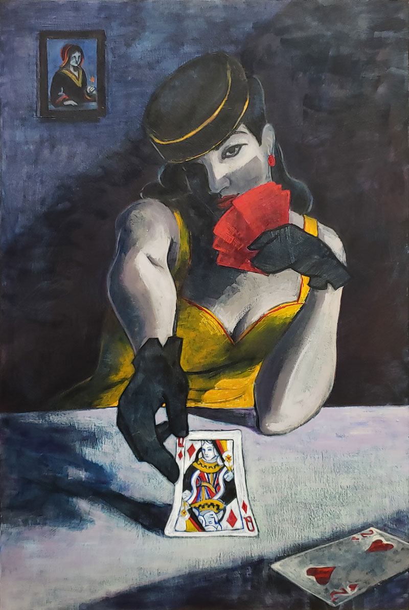 I am fascinated by playing cards and their symbolism. I recently felt inspired to make a painting with a woman playing cards with us, the viewer, and at the same time doling out our fate. A real woman, and a quasi-super-natural element of fate at the same time.